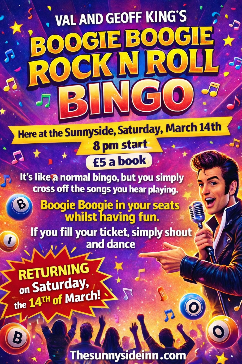 Sat the 14th of March 2026 join us for Val and Geoff Kings incredible Boogie Boogie Rock n Roll Bingo..